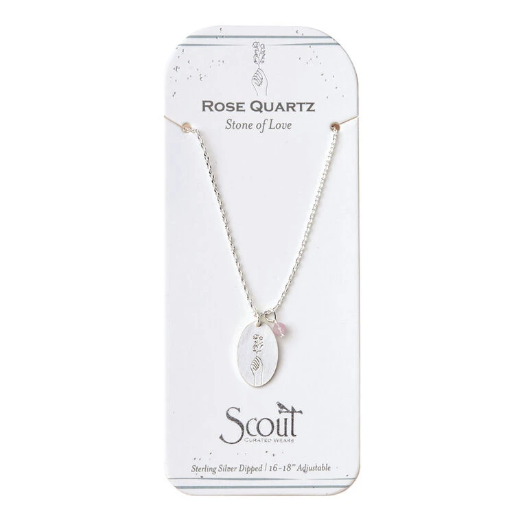Reflect your intention for the day when you wear this lovely intention charm necklace by Scout Curated Wears. Necklace features a tiny semi-precious rose quartz stone paired with a charm etched with a hand holding a bouquet of flowers. You’ll be accessorizing in style and sharing loving vibes with this charming jewelry. Presented on a gift card that shares the meaning of its stone, this necklace makes a great gift or a beautiful addition to your own jewelry collection.