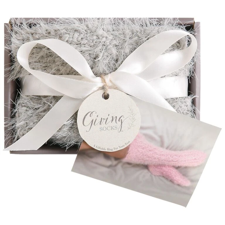 These soft taupe Giving Socks are a giftable hug for the feet. They have been knit together with love to remind someone that you’re always thinking of them with warm, fuzzy feelings, and a hug in your heart. Gift box packaging makes them a perfect choice for any occasion or just because she deserves a little pampering.